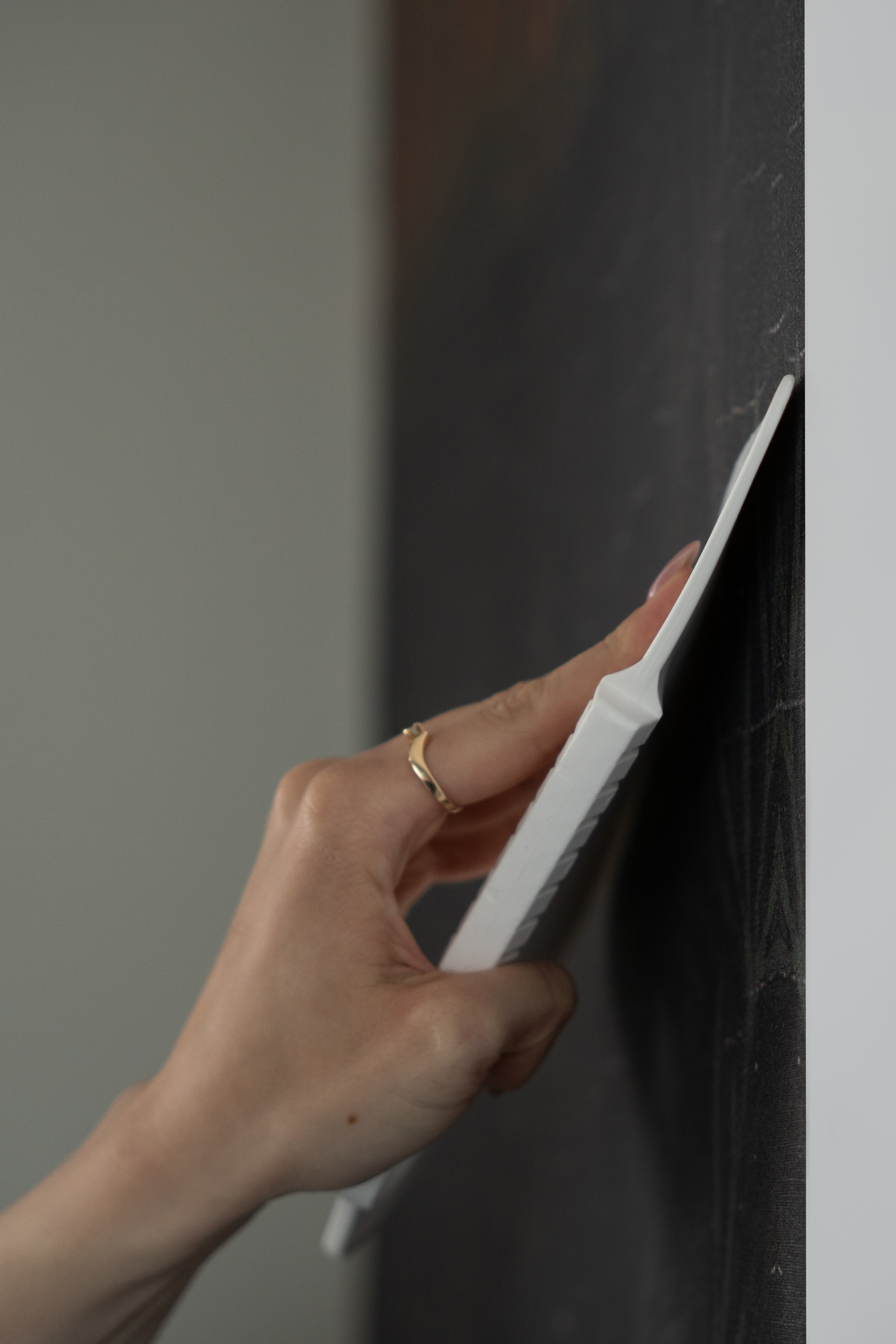 Excess wallpaper (waste) should be cut off with a utility knife after installation, pressing the edge of the wallpaper to avoid tearing it while cutting.