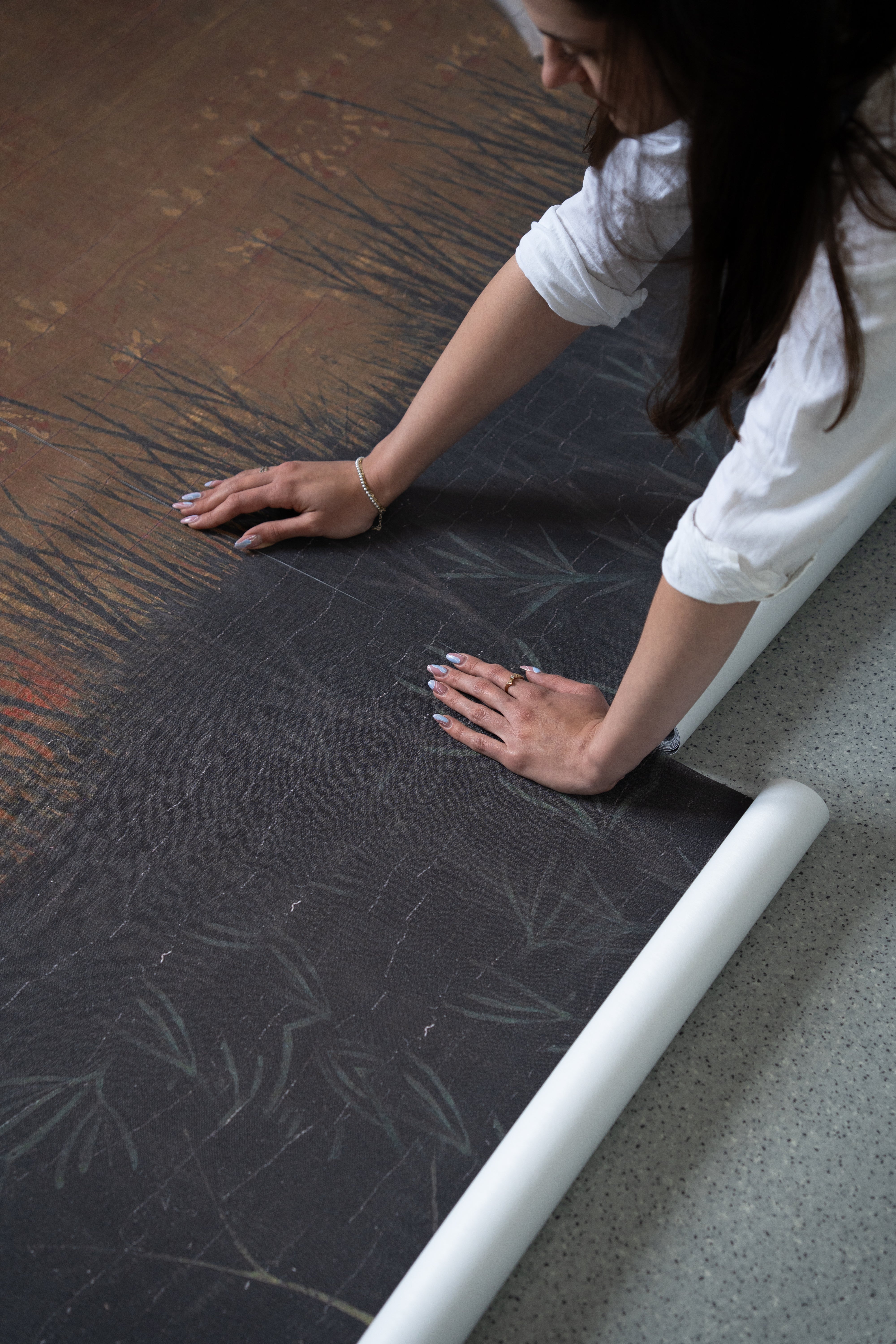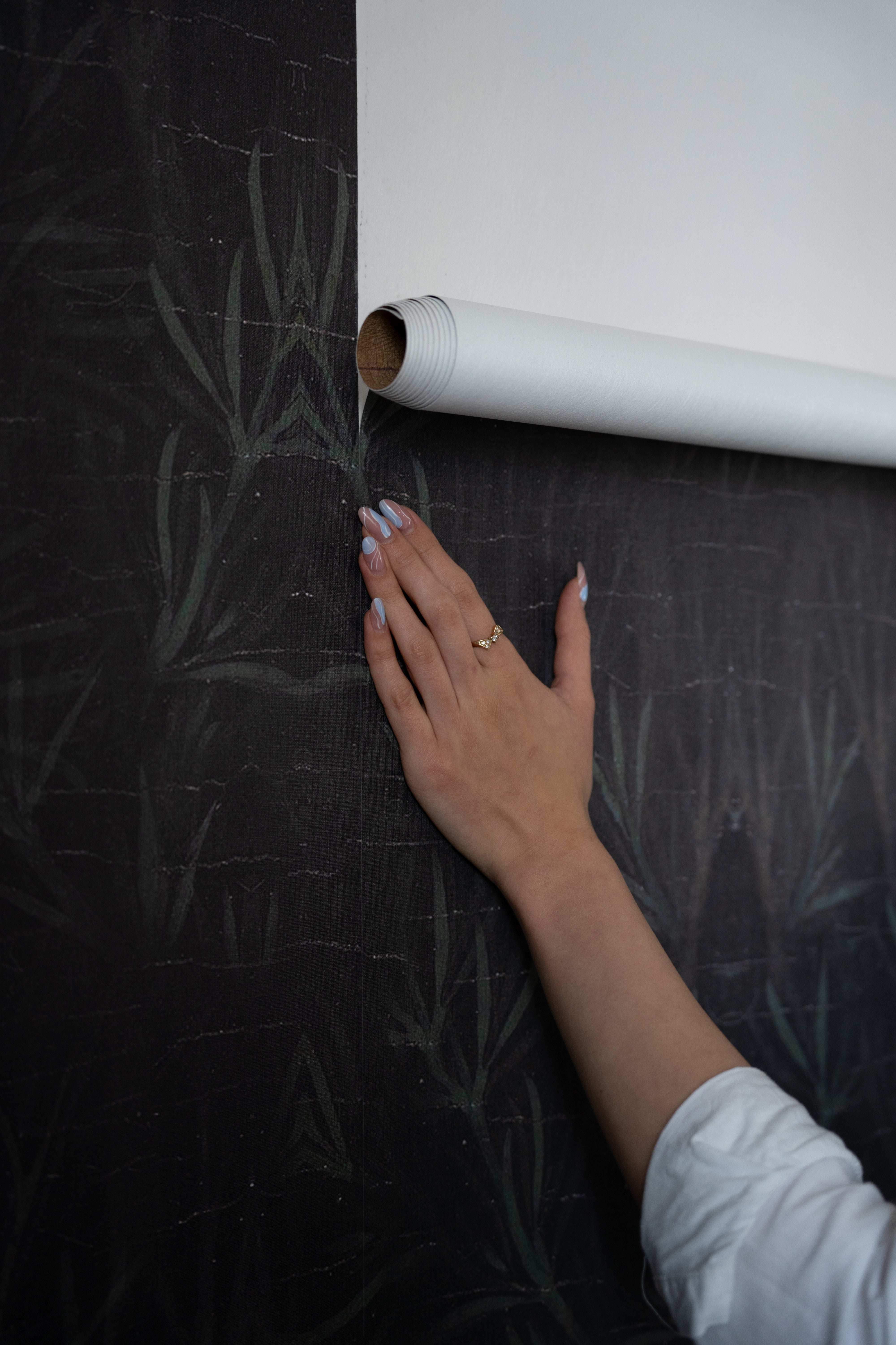 Gradually separate the backing from the adhesive layer, unrolling the wallpaper from top to bottom. Press it down with a smoothing tool, removing air from beneath the surface. Adhere the next strips edge to edge, matching the pattern.