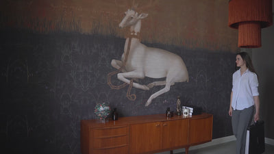 To accurately install the wallpaper, measure and draw a vertical line on the wall or mark the line using a laser level. The line marked on the wall should correspond to the width of the first strip of your wallpaper. Remember that the wallpaper has a 2.5cm / 1in allowance on each side, and wallpapering always starts from the left side, so the line indicating the width of the first strip should be shifted to the left by 2.5cm / 1in.